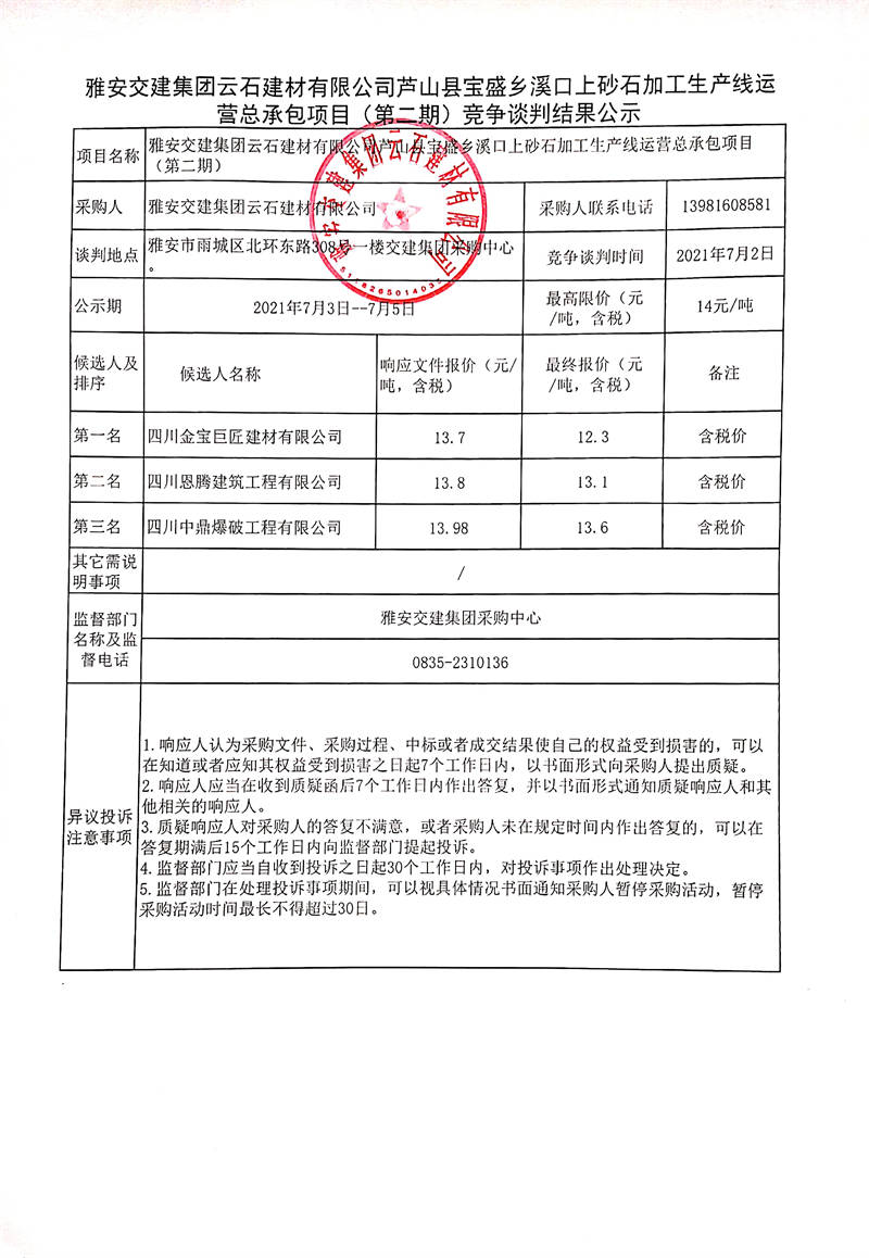 雅安交建集團(tuán)云石建材有限公司蘆山縣寶盛鄉(xiāng)溪口上砂石加工生產(chǎn)線運(yùn)營總承包項目(第二期)競爭談判結(jié)果公示