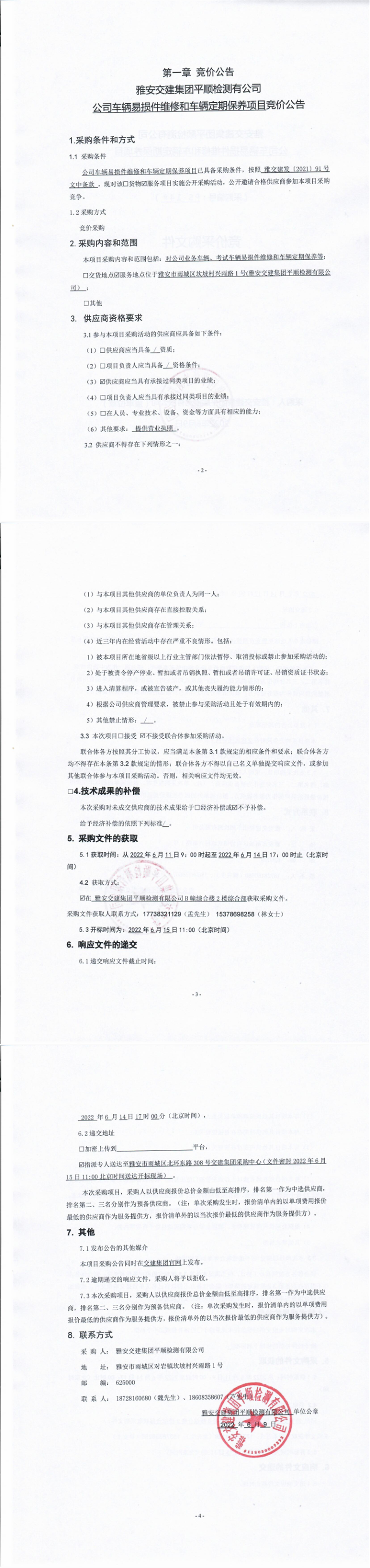 雅安交建集團(tuán)平順檢測有限公司公司車輛易損件維修和車輛定期保養(yǎng)項目競價公告