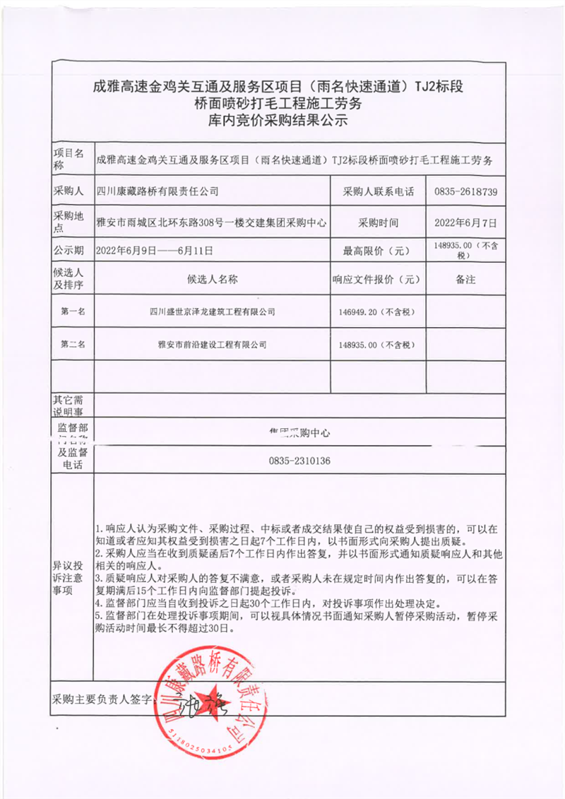 四川康藏路橋有限責任公司成雅高速金雞關(guān)互通服務(wù)區(qū)項目(雨名快速通道)TJ2標段橋面噴砂打毛工程施工勞務(wù)庫內(nèi)競價采購結(jié)果公示